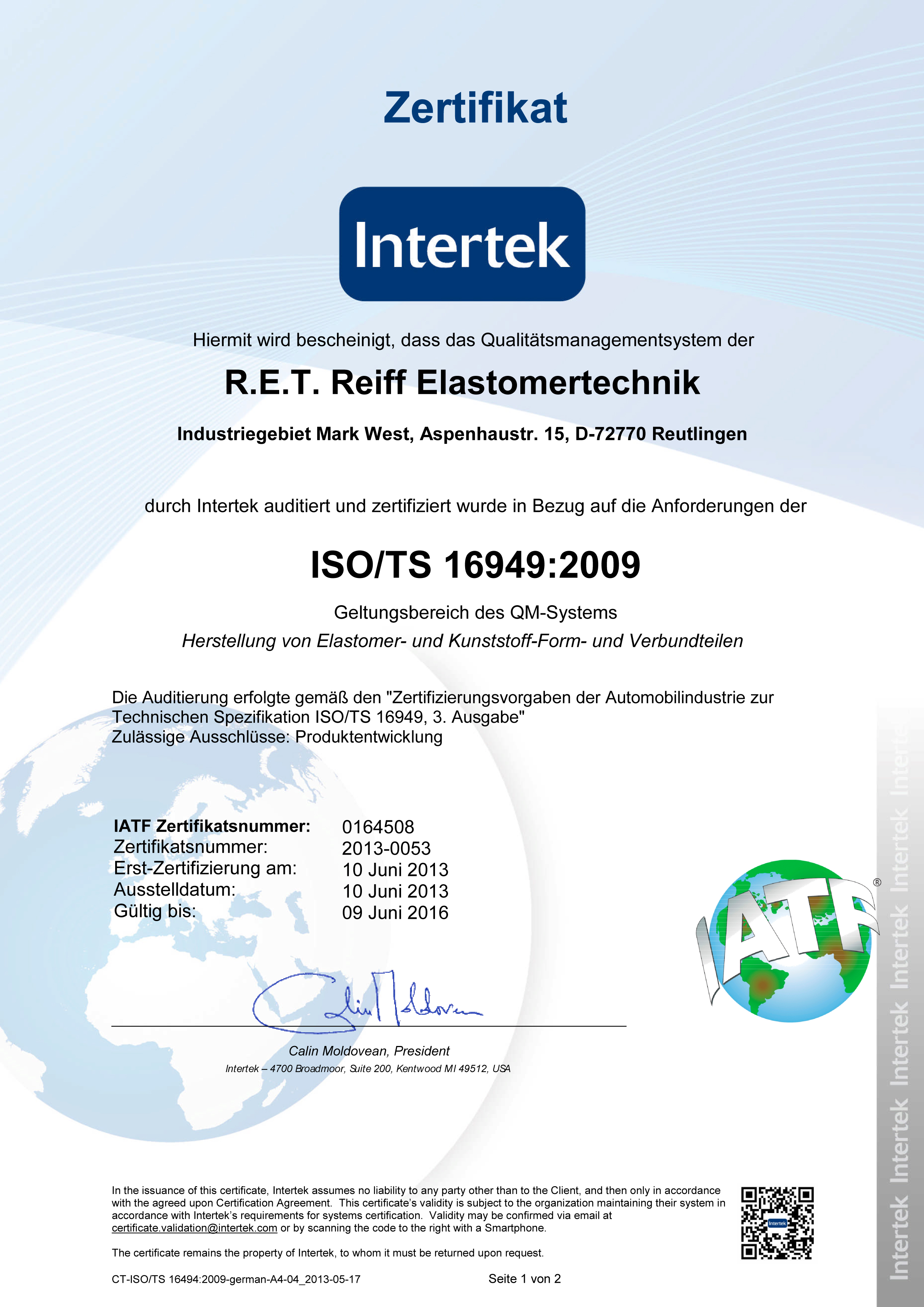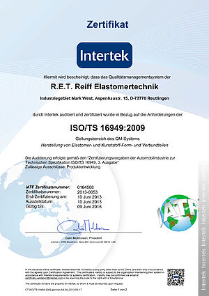 Im April 2013 wurde die R.E.T. REIFF Elastomertechnik GmbH nach ISO/TS 16949, der Champions League basierend auf der Technischen Spezifikation EN ISO 9001, rezertifiziert. Mit der erneuten Überprüfung beweist das Unternehmen wieder seine konsequente Prozessorientierung, und dass es die allgemeinen Forderungen an Qualitätsmanagementsysteme der europäischen und nordamerikanischen Automobilindustrie seit mehr als zehn Jahren erfüllt. Das Zertifikat ist drei Jahre gültig und muss jährlich von den Auditoren bestätigt werden. Eine wesentliche Forderung der ISO/TS 16949 ist die kontinuierliche Verbesserung der System- und Prozessqualität, um die steigenden kundenspezifischen Anforderungen zu erfüllen. R.E.T. hat sich in seinen 2003 verfassten Unternehmensleitsätzen zu höchster Qualität verpflichtet. Dort heißt es: „Die Qualität unserer Teile steht für uns an oberster Stelle. Unsere Prozesse werden ständig in Richtung ‚Null-Fehler‘ optimiert.“