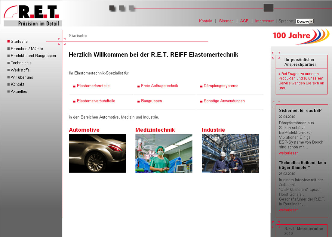 Die Produktentwicklung und -fertigung steht klar im Fokus der Elastomerspezialisten. Erst 2006 wurden die Produktionswerke des Unternehmens in Reutlingen-Betzingen neu gebaut. Ein Blick in die in drei Fraktale eingeteilte Fabrik zeigt modernste Anlagen, innovative Produktionsverfahren und maximale Flexibilität. „Diese Stärke der R.E.T. zeigen wir mit unserem Internetauftritt jetzt auch deutlich nach außen“, erklärt Horst Schäfer. „Interessenten und Kunden haben gleichermaßen die Möglichkeit sich über unser Unternehmen, das Know-how und die Produktionsmöglichkeiten zu informieren.“ Auf www.ret-gmbh.de präsentiert das Reutlinger Unternehmen sein gesamtes Können auf das namhafte Kunden aus allen Branchen seit Jahrzehnten vertrauen. Die R.E.T. entwickelt und produziert für Unternehmen aller Branchen. Die Präzisionsverbindungen aus Silikon und Metall sind vor allem in der Medizintechnik und der Automobilzuliefererindustrie gefragt. Aber längst wird nicht nur die Entwicklung und Produktion von unterschiedlichsten Elastomerverbundteilen übernommen: Um Kundenanforderungen optimal zu erfüllen übernimmt die R.E.T. auch die Fertigung komplexer Baugruppen. Beispiele dafür, wie das aussehen kann, befinden sich natürlich ebenso auf der neuen Website, wie die dafür verwendeten Werkstoffe und Technologien.