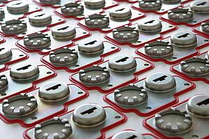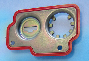 Die Steuerplatte ist ein Verbundbauteil aus Stahlblech in Stanz-/ Biege-Umformtechnik und umlaufender, anvulkanisierter Silikondichtlippe. Die Silikondichtlippe ist im Injection-Moulding-Verfahren an die Stirnfläche des Blechträgers anvulkanisiert. Das Silikon stammt aus einer selbsthaftenden LSR-Mischung, das Stahlblech ist nicht vorbehandelt. Dennoch ist die Haftung des Elastomers am Metall exzellent. Die Blechdicke von 1,5 mm begrenzt den Verformungsweg der Dichtlippe, da sie gleichzeitig als definierter Anschlag für beide Dichtlippen oben und unten dient. Die Dichtung hat eine außen liegende Schutzlippe, die die Dichtlippen gegen grobe Einwirkungen wie z. B. den Strahl eines Hochdruckreinigers schützt. In zusammengebautem Zustand werden die Dichtlippen exakt 35 % zwischen Aluminium-Druckgussteil und Gehäuse verpresst. Dabei werden die Dichtlippen nach außen verdrängt und gewährleisten somit eine optimale Dichtwirkung. Diese Technologie garantiert die geforderte hohe Lebensdauer im Kfz-Bereich und die Schutzklasse IP 65.