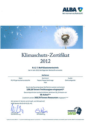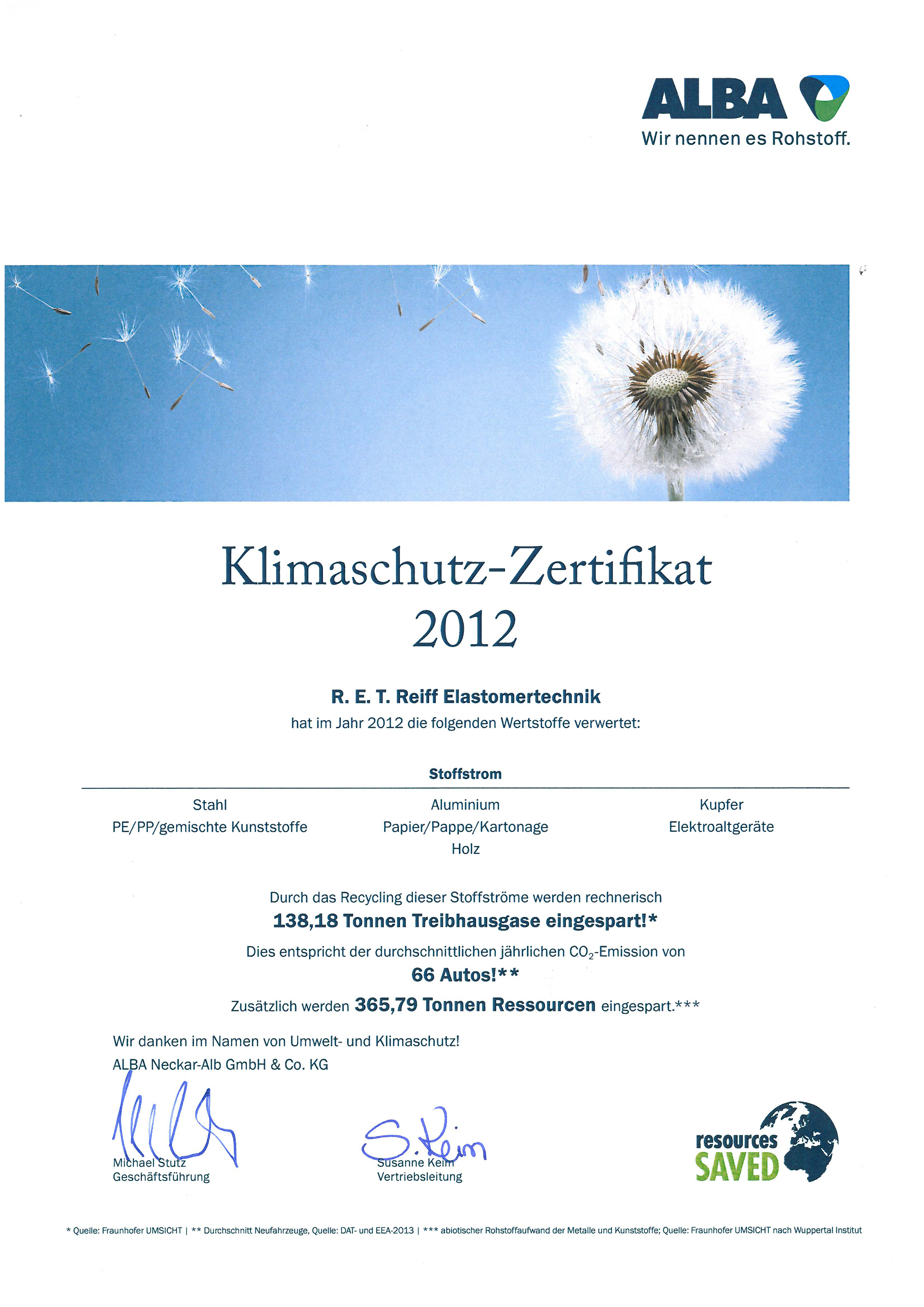 2012 vermied die R.E.T. durch die Verwertung der Stoffströme rechnerisch 138 Tonnen Treibhausgase, was der durchschnittlichen jährlichen CO2-Emission von 66 Autos entspricht. Zudem werden rechnerisch 366 Tonnen Ressourcen eingespart. Dies belegt das Klimaschutz-Zertifikat 2012, welches das Unternehmen von der ALBA Group verliehen bekam. Die aufgeführten Zahlen basieren auf einer umfassenden Studie zu Treibhausgas-Einsparungen des renommierten Instituts Fraunhofer-Institut.